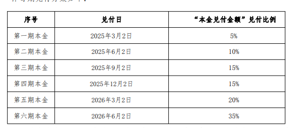 剩余本金(合计面额15亿元)兑付时间调整为自2025年3月2日起至2026年6月2日。自2025年3月起,本期债券剩余本金兑付金额开始分期兑付。