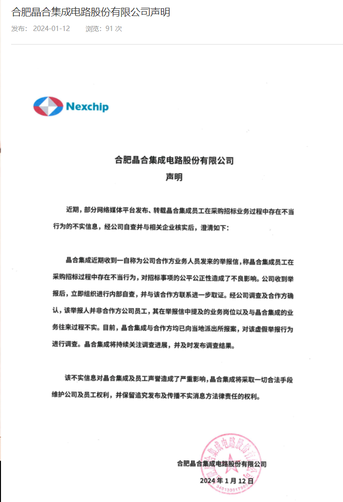 1月12日,晶合集成也在其官网发布声明称,近期收到一封自称为公司合作方业务人员发来的举报信,称晶合集成员工在采购招标过程中存在不当行为,对招标事项的公平公正性造成了不良影响。公司收到举报后,立即组织进行内部自查,并与该合作方联系进一步取证。