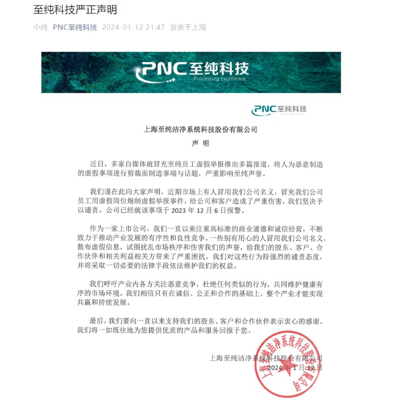 至纯科技在声明中表示,近期市场上有人冒用公司名义,冒充公司员工用虚假岗位炮制虚假举报事件,给公司和客户造成了严重伤害,坚决予以谴责。对这类行为持强烈的谴责态度,并将采取一切必要的法律手段维护公司权益。