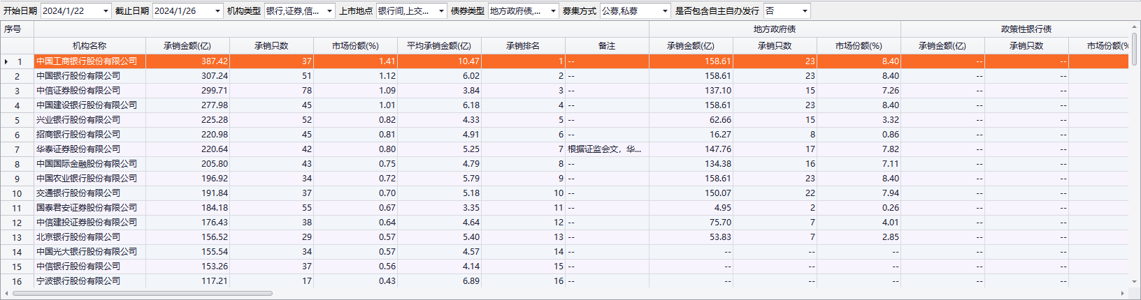上证报中国证券网讯 据Choice数据统计显示,上周(1月22日至1月26日)债券承销金额较高的机构有:工商银行、中国银行、中信证券,承销金额分别为387.42亿元、307.24亿元、299.71亿元。此外,建设银行、兴业银行、招商银行等5家机构上周债券承销金额也均超过200亿元。