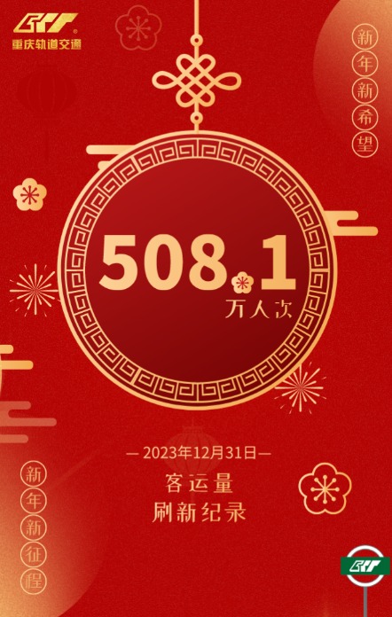 2023年12月31日,重庆中心城区公共交通客流806.7万人次,其中地面公交298.6万人次,轨道交通508.1万人次。重庆轨道交通全线网客运量达508.1万人次,创下历史最高客运纪录,之前最高为2023年9月28日的494.2万人次。